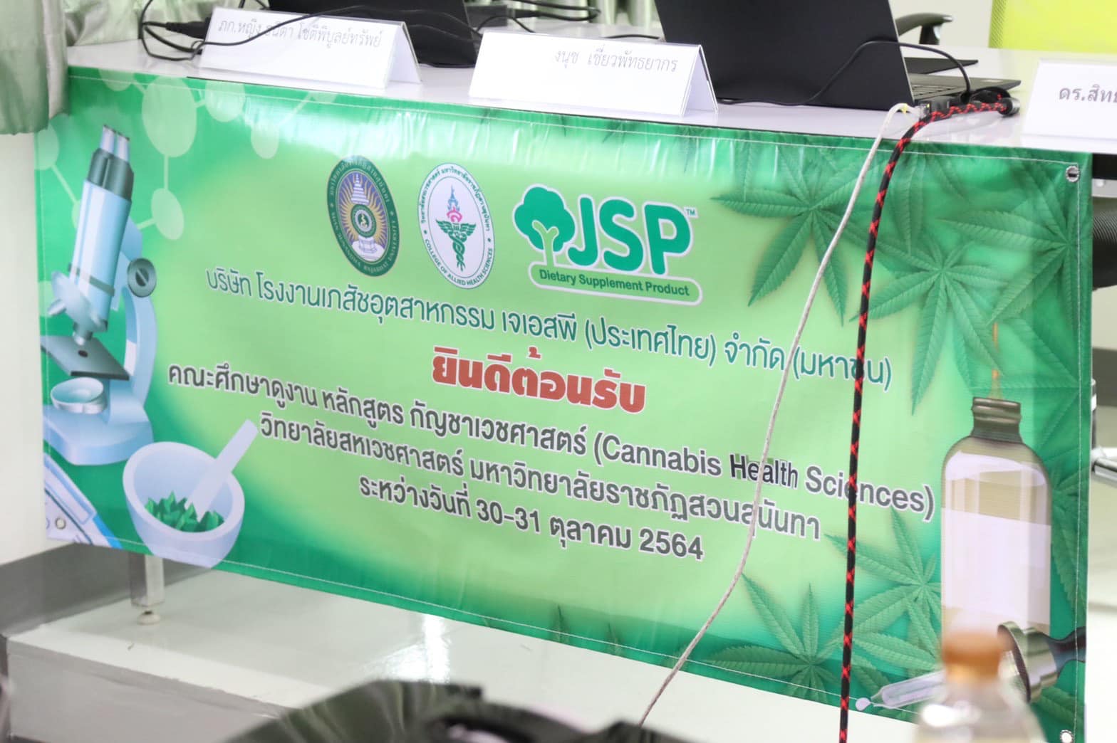 “วิทยาลัยสหเวชศาสตร์รู้สึกซาบซึ้งและขอขอบคุณบริษัท โรงงานเภสัชอุตสาหกรรม เจเอสพี (ประเทศไทย) จำกัด (มหาชน) มา ณ โอกาสนี้ รวมถึงความร่วมมือทางวิชาการในการวิจัยและการผลิตยาสมุนไพรที่มีส่วนผสมของกัญชาเพื่อให้บริการแก่ประชาชน ได้แก่ ยาฟ้าทะลายโจร ยากระชายพลัสมิเนอรัล ยาจันทน์ลีลา ยาขิง ยาห้าราก เป็นต้น”